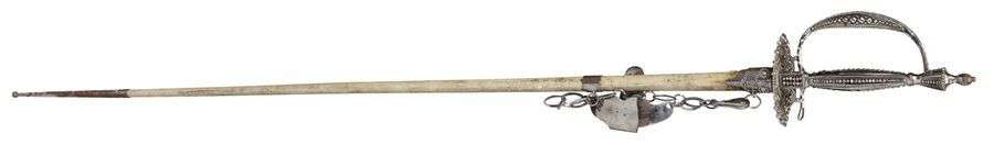 Le noeud de corps, la branche de garde, la fusée et le pommeau conique, tous en fer, présentent de semblables boules à facettes en chapelets mobiles, mais plus longs, et motifs en pointes de diamant.