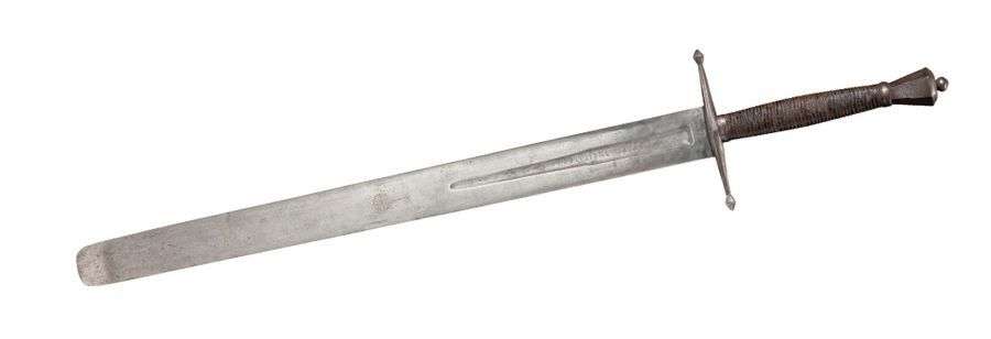 Fusée en cuir filigranée de fer. Fort pommeau conique à pans, surmonté d'une boule aplatie.
