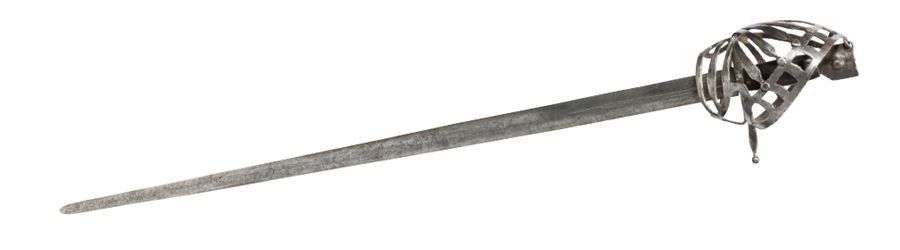 Monture en fer. Garde à une grille et quatre languettes. Fusée en bois et pommeau en tête de chat.