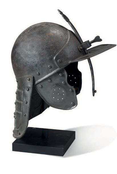 Bombe en deux parties, Le couvre-nuque fixe, dit "en queue d'écrevisse", est ouvragé de façon à représenter 3 lames.