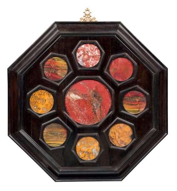 PAIRE DE CADRES en ébène de forme octogonale. Ils présentent des échantillons de marbre de couleur dans des médaillons.
