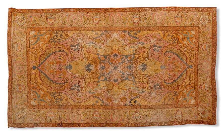 Champ jaune d'or à très large médaillon central floral géométrique vieux rose orné de palmettes fleuries bleu de Prusse en forme de diamant stylisé géométriquement.