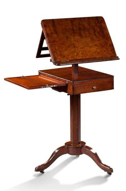 LUTRIN en acajou et placage d'acajou moucheté à combinaisons. Il ouvre par trois tiroirs et une tirette dépliante. La partie supérieure supportée par une tige ajustable se déplie pour former le lutrin. Le montant repose sur un piètement tripode à roulettes.