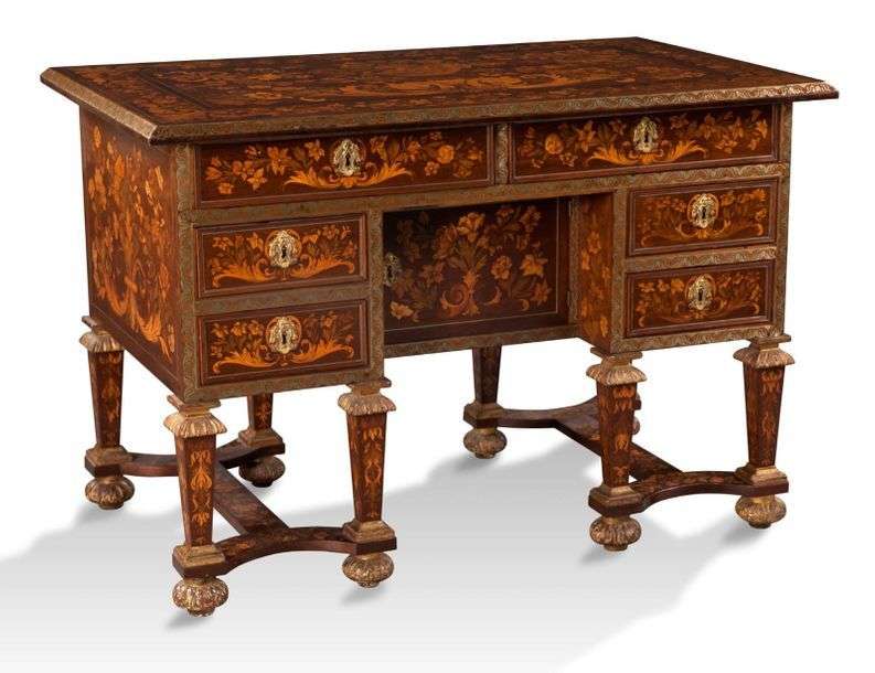 Ce meuble à écrire, dont le superbe travail de marqueterie n'est pas sans rappeler les réalisations de Pierre Gole (vers 1620-1684), nommé maitre menuisier en ébène du roi Louis XVI et son entourage, constitue l'un des premiers modèles de bureau apparu dans la capitale vers 1660-1670. On retrouve cette marqueterie de fleurs très appréciée autant que l'exubérance des végétaux ou animaux qui courent sur l'ensemble du bâti à la structure architecturale prononcée.