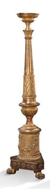 PAIRE DE PORTE-TORCHÈRES en bois mouluré sculpté et doré reposant sur un socle tripode terminé par des pieds griffe