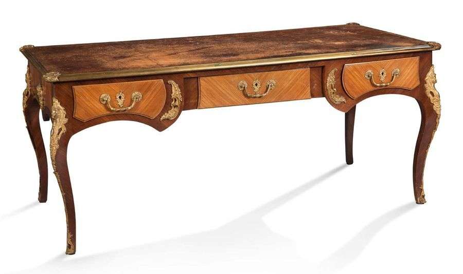 Riche ornementation de bronzes ciselés dorés à décor de bustes de femme et masques. Le plateau est recouvert d'un cuir couleur cognac doré aux petits fers et ceint d'une lingotière aux écoinçons à motifs de coquilles.