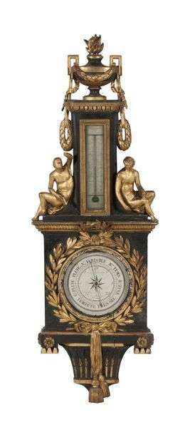 BAROMÈTRE THERMOMÈTRE SELON RÉAUMUR en bois mouluré sculpté doré et laqué noir, orné d'une couronne de lauriers rubannée flanqué de deux femmes à l'antique et surmonté d'une urne flammée. Prises en forme de grecques.