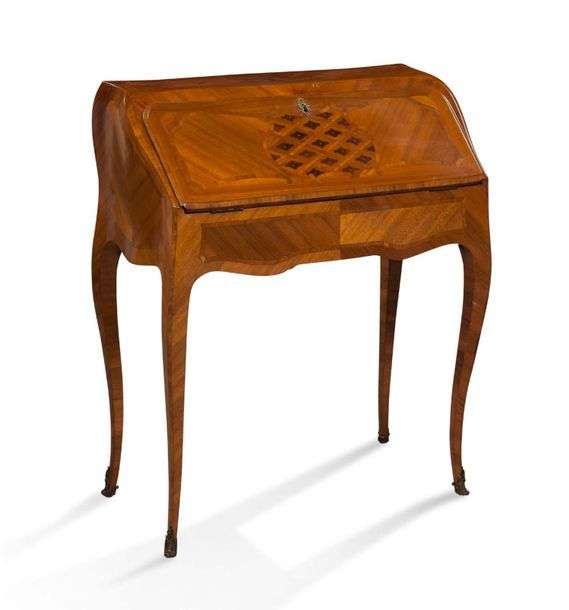 PETIT BUREAU DE DAME de forme mouvementée en placage de satiné toutes faces. L'abattant à décor de croisillons ouvre et découvre deux tiroirs et trois casiers. Il repose sur quatre pieds cambrés terminés par des sabots de bronze.