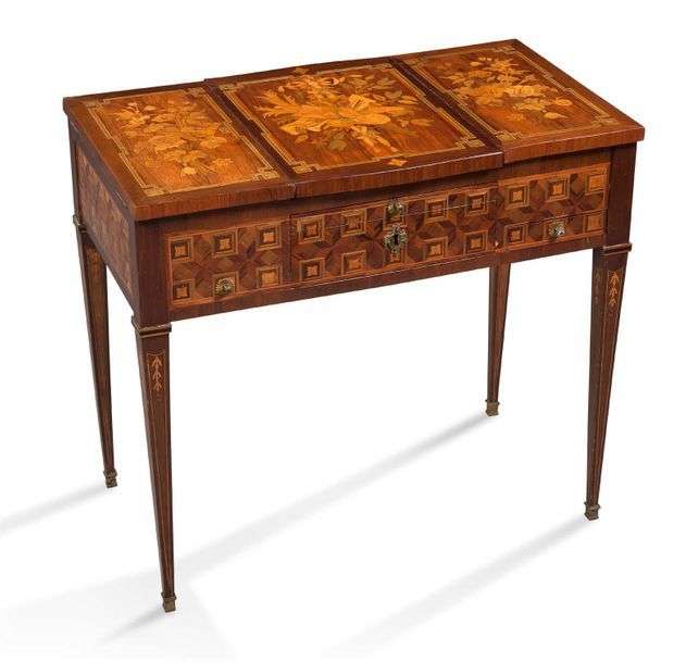 PETITE POUDREUSE en placage de bois divers à décor de compositions aux ins