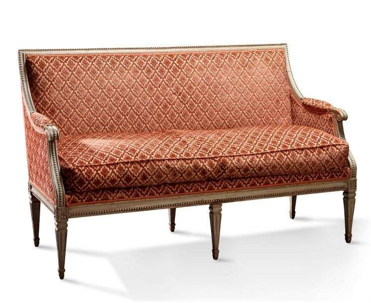 SALON en bois laqué crème mouluré et sculpté de rangs de perles. La ceinture droite est réunie par des dés de raccordement à rosaces reposant sur des pieds gaine à cannelures rudentées. Il comprend un canapé, six fauteuils, six chaises à dossier plat et un écran.