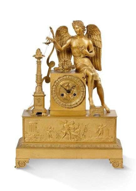 PENDULE en bronze ciselé doré surmontée d'un jeune homme à l'antique ailé à l'arc et au carquois tenant une rose et une libellule. Elle repose sur une base quadrangulaire ornée d'une frise à l'antique.