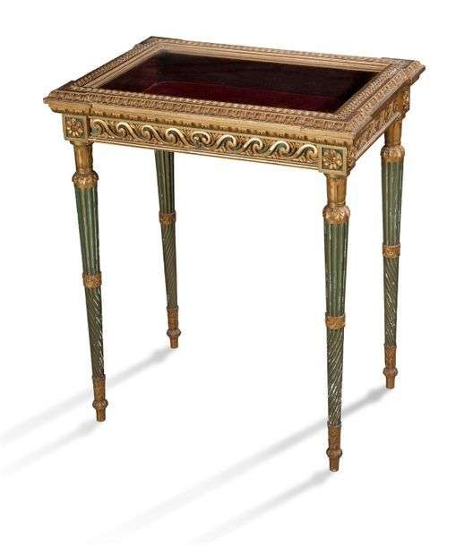 TABLE VITRINE de forme rectangulaire en bois sculpté doré à décor de frises d'oves, postes et rinceaux. Elle repose sur quatre pieds fuselés cannelés et torsadés laqués vert