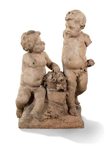 Paire de groupes en terre cuite sculptée formés pour chacun de deux putti