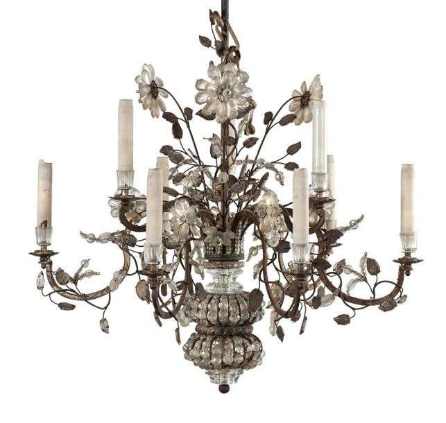 LUSTRE attribué à la maison Baguès à neuf bras de lumière en métal et cristal taillé orné de fleurettes, boules facetées et feuillage.