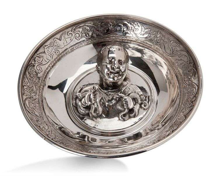 Réplique d'une coupe antique en métal argenté ornée au centre d'un enfant entouré de serpents.