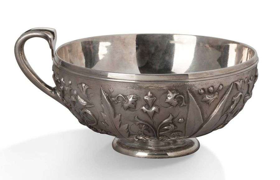 COUPE CHRISTOFLE en métal argenté. Coupe sur piedouche à décor de feuillage et rinceaux Trésor d'Hildesheim