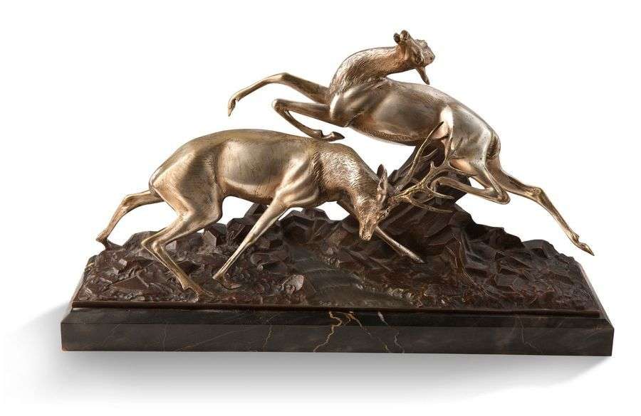 Bronze à double patine argentée et brune reposant sur une base en marbre portor.