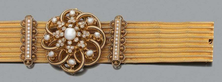 Ruban et motif central amovible, diamants de taille ancienne, émail noir et perles fines, or jaune 18k (750).