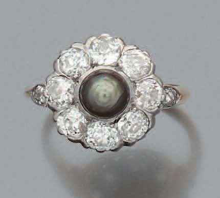 Perle fine grise, diamants de taille ancienne, or 18k (750).