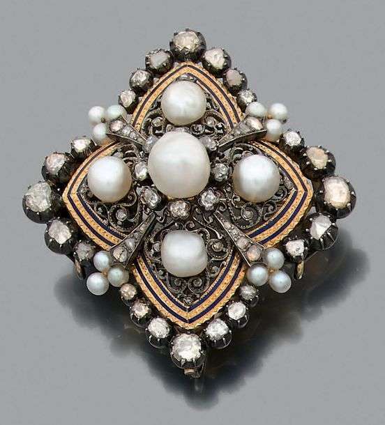Perles supposées fines, non testées, diamants taillés en rose, or 18K (750), argent (<800) et émail bleu.