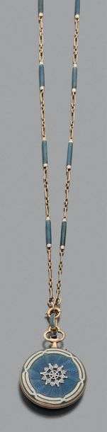 A gold, diamond, blue and white enamel necklace and watch.