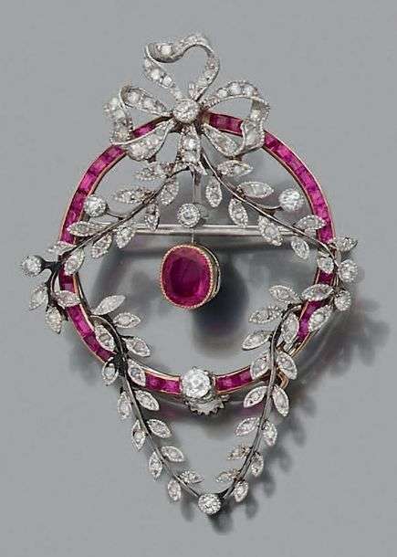 A gold, platinum, ruby and diamond broochpendant.