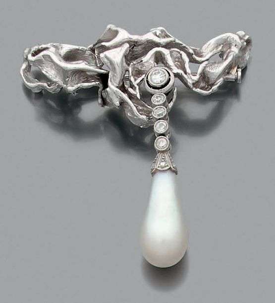 Perle fine goutte, diamants, or 18k (750) et platine (950).