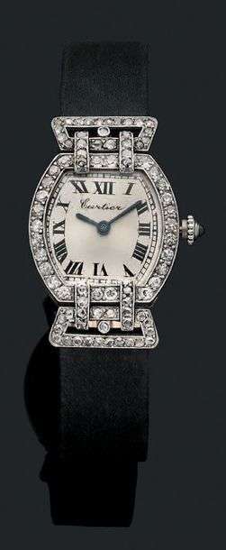 Montre de dame, forme tonneau, entourage diamants de taille huit huit, platine (950) et or 18k (750). Mouvement postérieur quartz. Boitier numéroté.