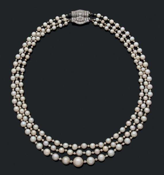 Perles fines. Ensemble composé de deux colliers formés de trois rangs de perles fines. Signés. Un collier composé de deux rangs de 53 et 49 perles en chute, supposées fines, non testées.