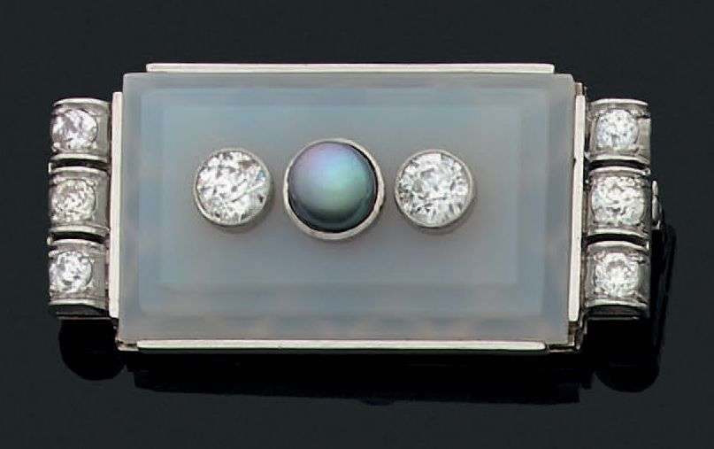 Cristal de roche dépoli, diamants de taille ancienne, perle de culture grise forme bouton, PLATINE (850).