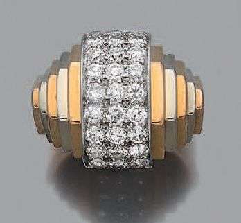 Bague "rouleau à gradins" diamants ronds, or jaune et gris 18k (750), PLATINE (950)..