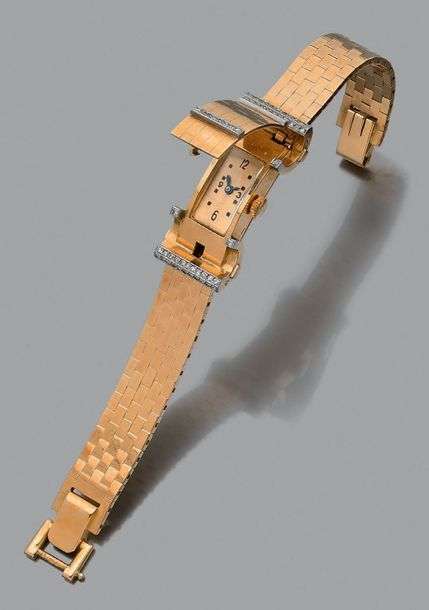 Bracelet "brique", capot bombé, lignes de diamants ronds, or 18k (750) et platine (950). Travail français.