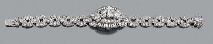Diamants ronds et diamants baguettes, platine (950) et or gris 18K (750).