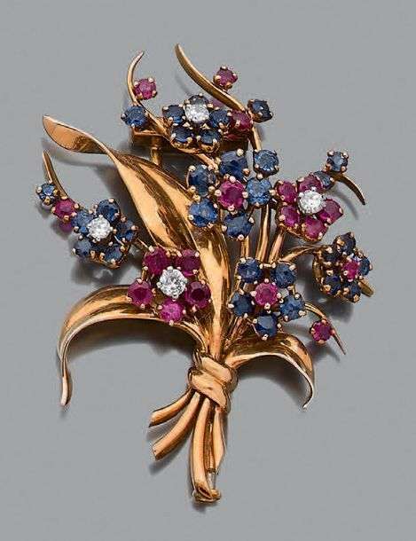 Clip "bouquet de fleurs" rubis, saphirs et diamants, platine (950) et or 18k (750)