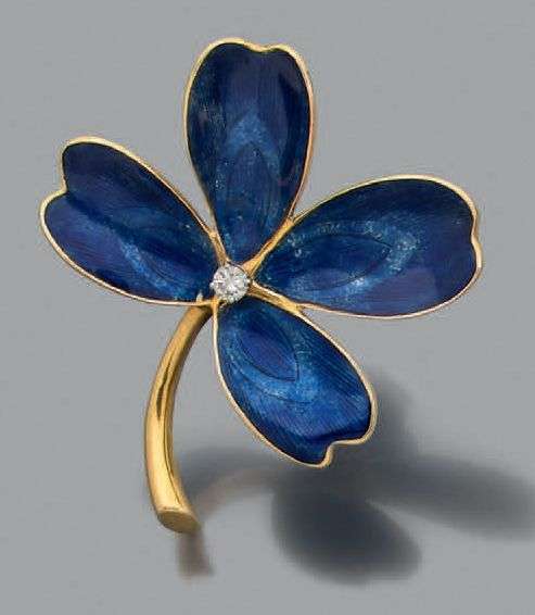 Clip "trèfle" émail bleu, or jaune 18K (750). Signé et numéroté. Vers 1960.