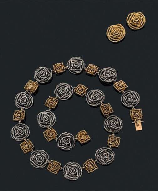 "Arcade" Ensemble collier et bracelet formant sautoir et paire de clips d'oreilles, or jaune et gris 18k (750). Signés et poinçon de maitre. Vers 1970. Ecrin. Pb.:117.3gr