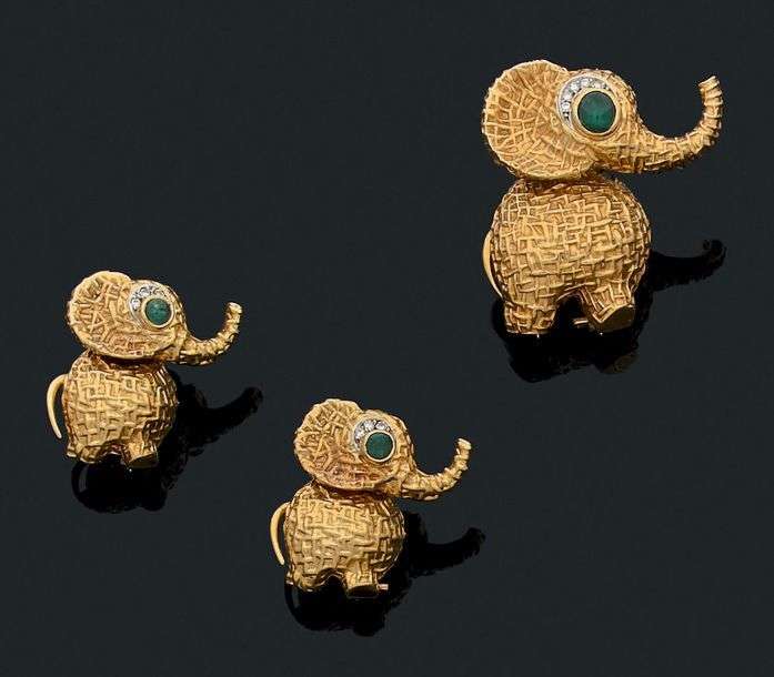 Ensemble de trois clips "éléphants" diamants et or 18k (750) et platine (950).