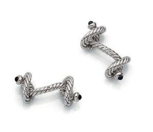 Paire de boutons de manchette en or gris 18K (750) torsadé sertie de cabochons de saphirs aux extrémités.