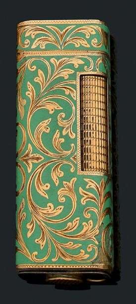 A gold and green enamel lighter.