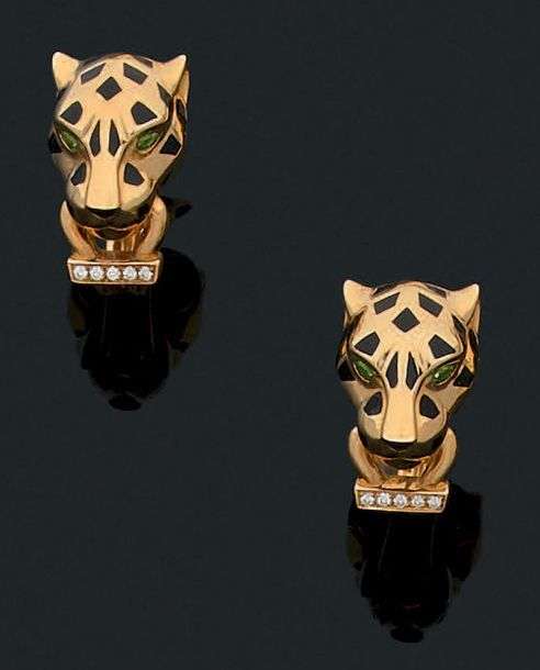 A gold, tsavorite, diamond, black enamel earrings. Signed by CARTIER.