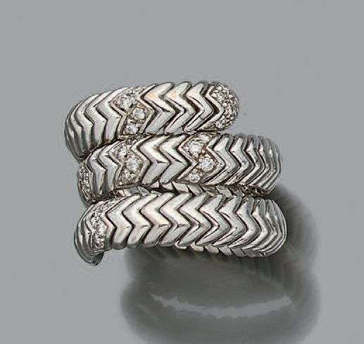 Bague "serpent" chevrons d'or gris flexible, diamants. Signée.