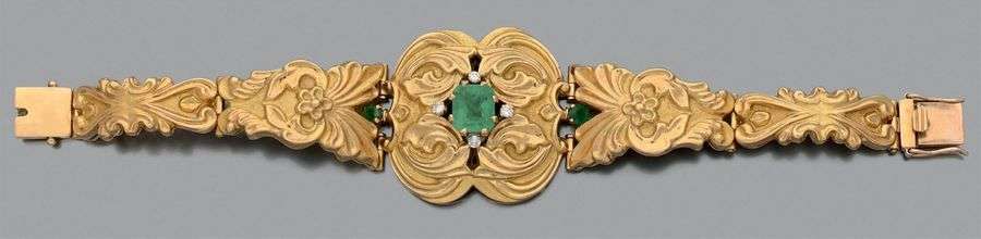 Emeraude rectangulaire, diamants ronds, or jaune 14k (585).