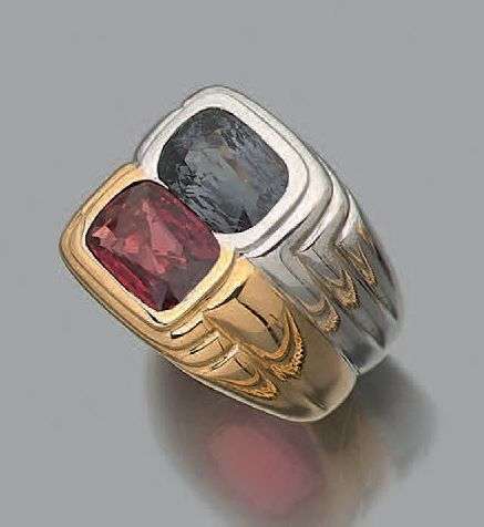 * Bague en or jaune et gris 18K (750) sertie de deux spinelles de forme co