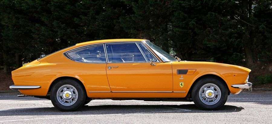 Lancé en 1967, le coupé Fiat Dino se veut être une authentique voiture de grand tourisme, faite pour circuler à quatre, à grande vitesse, dans d’excellentes conditions de confort et de sécurité. Commandé par Bertone, les stylistes légendaires Giugiaro et Gandini se sont penchés sur son dessin qui fut salué par la critique lors de sa présentation au Salon de Genève. Moderne avec une boite de vitesse à 5 rapports un différentiel à glissement limité et des freins à disque à quatre roues, Giovanni Agnelli, le magnat de l’industrie, était parmi les riches propriétaires à apprécier le modèle. Il est alors équipé d’un V6 2.0l entièrement en aluminium dérivé du moteur Dino 196 de course élaboré par Ferrari.