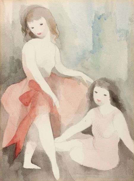 Cette aquarelle de Marie Laurencin condense tous les grands principes de son oeuvre. Il s'agit d'un double portrait de très jeunes femmes aux visages doux, rehaussés par leur tenue légère aux tons rose pâle. L'utilisation de l'aquarelle participe à cette impression d'évanescente qui se dégage de ces deux sylphides permettant de jouer sur les matières et les transparences. La palette aussi est très typique de l'oeuvre de l'artiste, elle reste dans une gamme de gris, de roses et de bleus habituels qui soulignent avec enchantement la fragilité et la délicatesse des jeunes femmes.