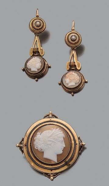 An agate, enamel and gold brooch and ear pendants, Napoleon III period.