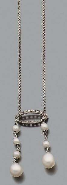 A diamond, pearl and gold necklace.