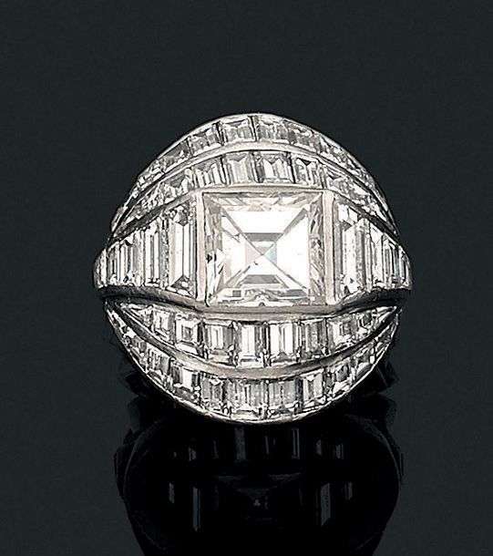 Diamant carré à pans coupés, diamants baguettes, platine (950). Vers 1940.
