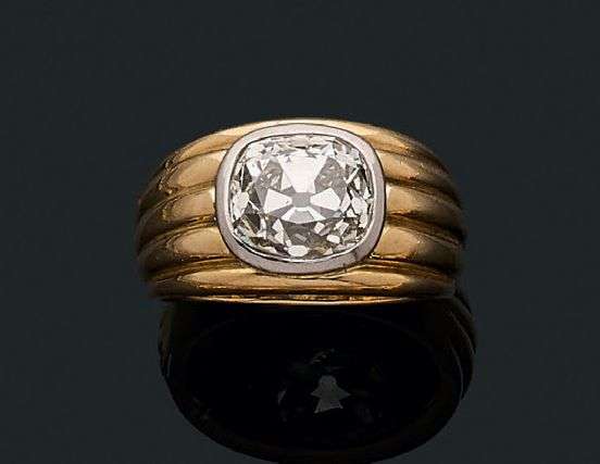 Diamant taille ancienne forme coussin, platine (950) et or jaune 18k (750).