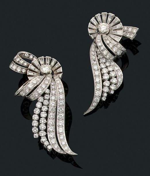 Diamants ronds de taille brillant et diamants baguettes, platine (950) et or gris 18k (750). Travail français.